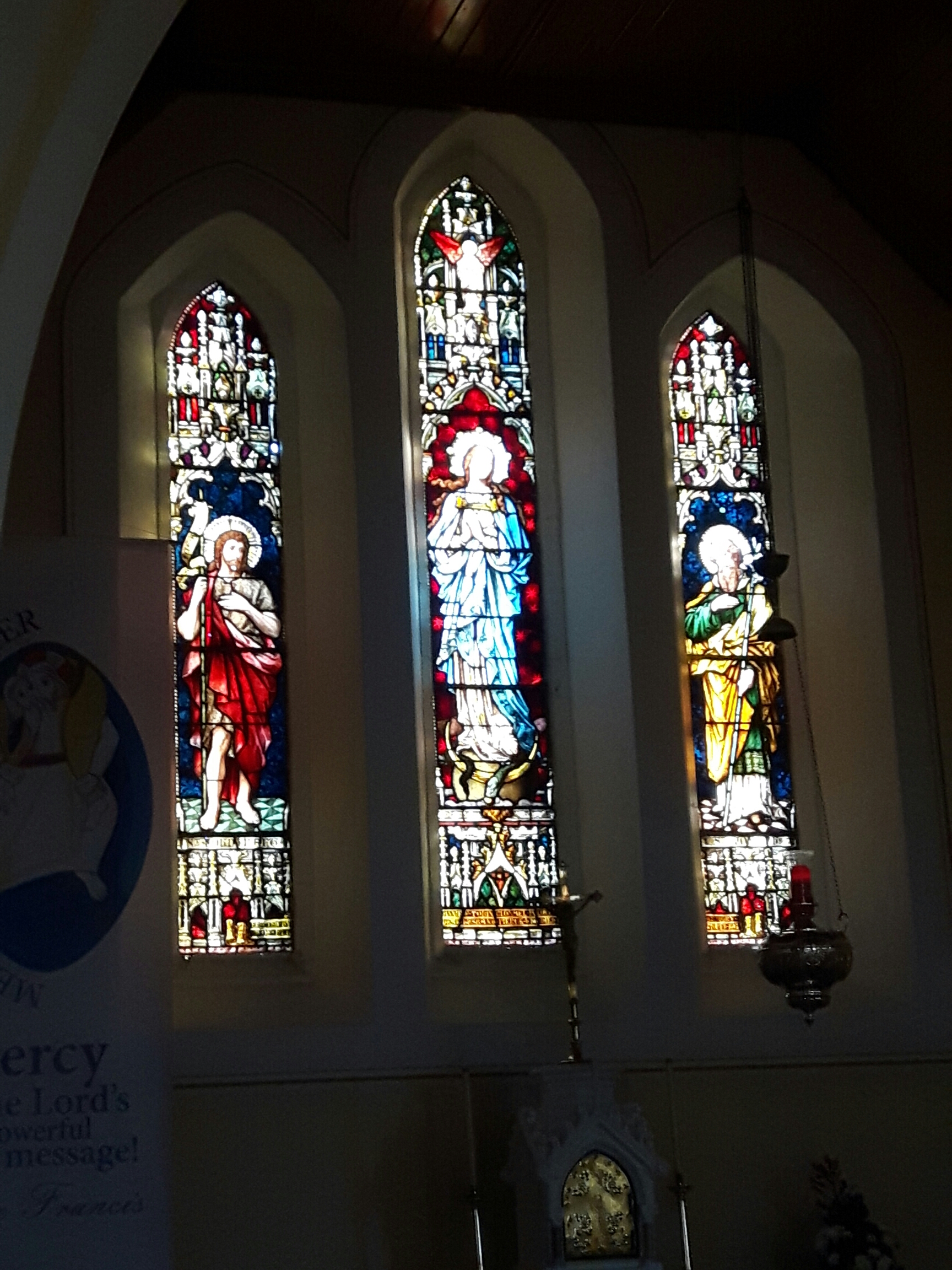 Firstly here are images of John the Baptist, Our Lady and St Joseph from the window behind the altar.