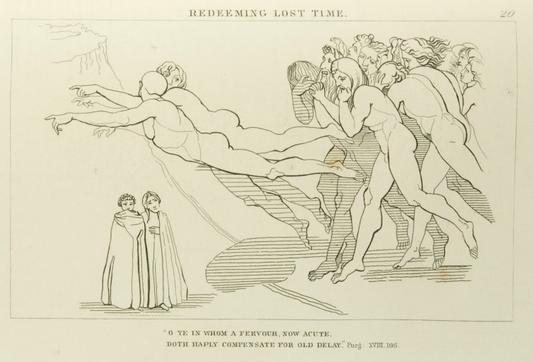 The slothful purge their sin by the opposite of what they indulged in in life – unrelenting speed. The commentary suggests that the compressed treatment of Sloth – the whole terrace within Purgatory being disposed of in half a canto – is a structural reflection of the purgation of sloth. In the commentary, one gets the sense that the depiction of slothful is very much secondary to the opening discussion of Love. However, reading LeGrand, especially her sections on Aquinas, I wonder if the slothful are more central to the discussion of Love than the commentary might suggest.