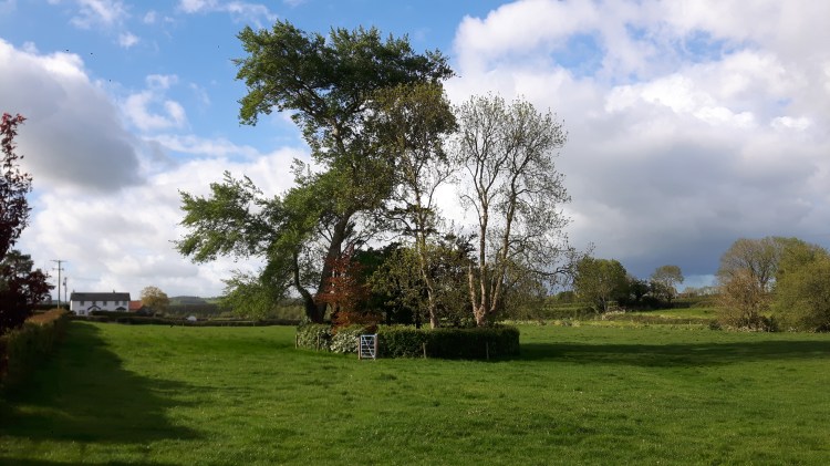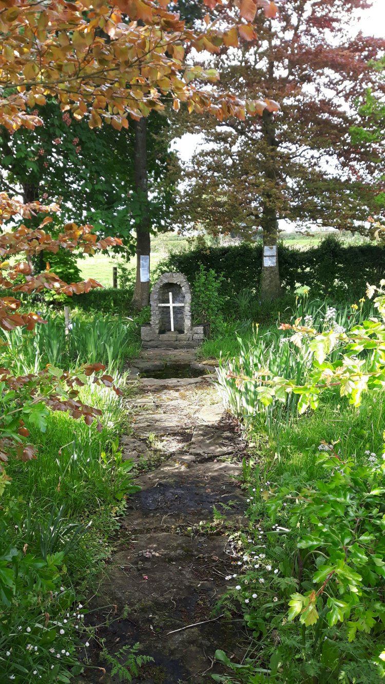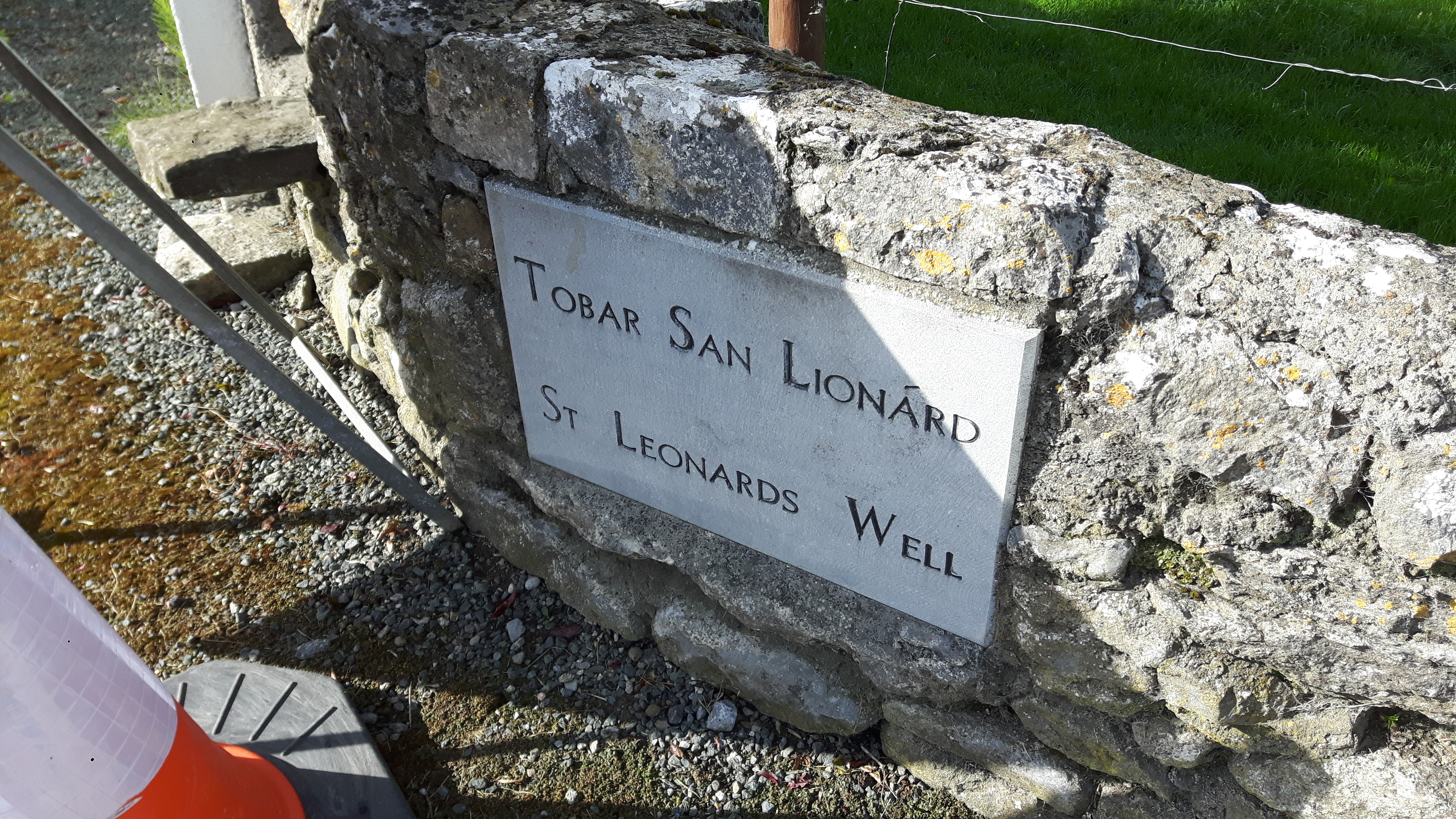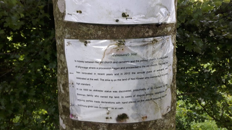 This reads “St Leonard’s Well is midway between the old church and cemetery and the present church. It was a place of pilgrimage where a procession began and proceeded to the old church. The well has been renovated in recent years and in 2012 the annual mass of welcomes was celebrated at the well. The area is on the land of Ned Kirwan who maintains it to a very high standard”