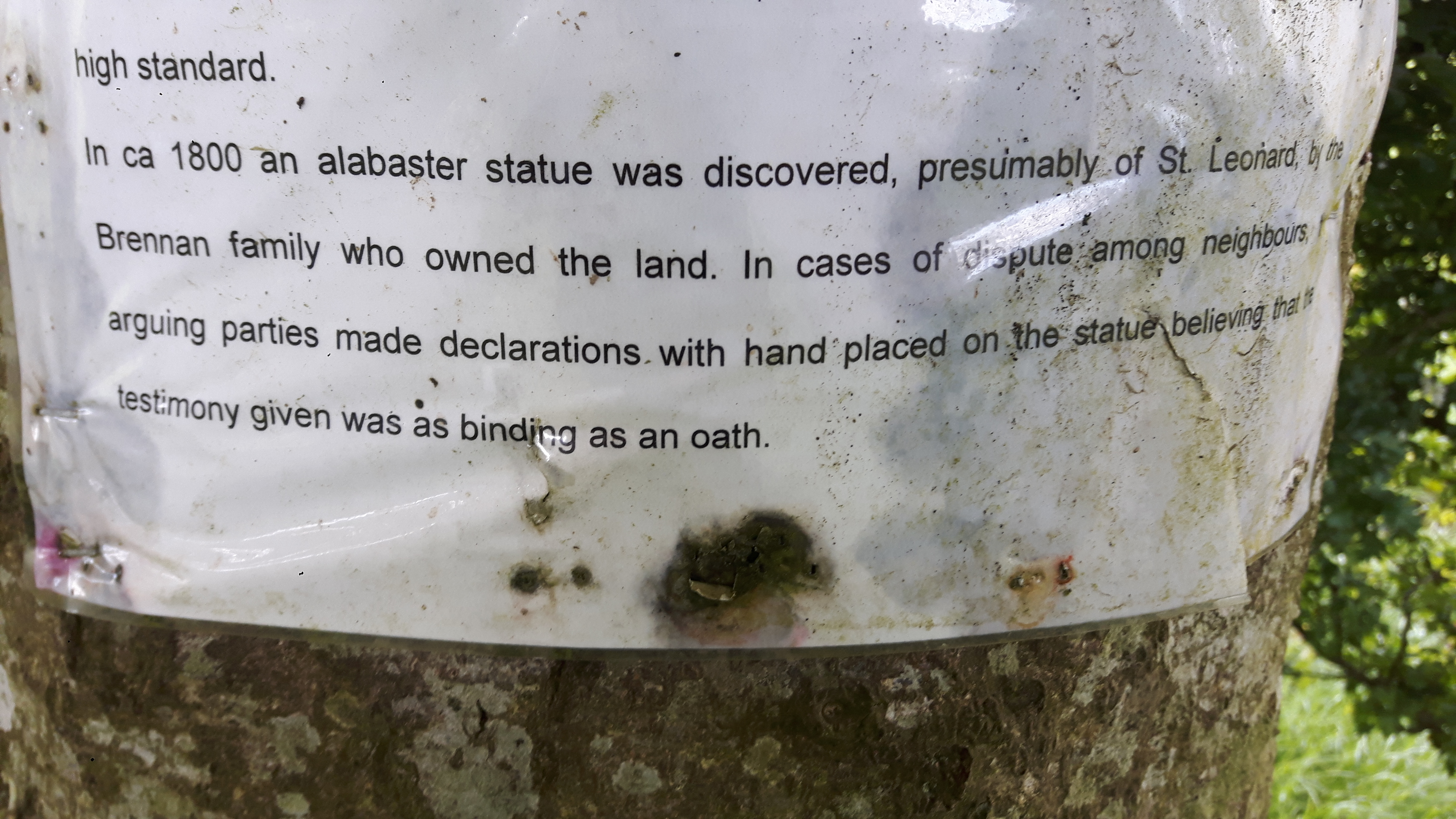 “In ca 1800 an alabaster statue was discovered, presumably of St Leonard, by the Brennan family who owned the land. In cases of dispute among neighbours, arguing parties made declarations with hand placed on the statue believing that the testimony given was as binding as an oath.”