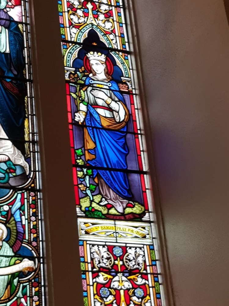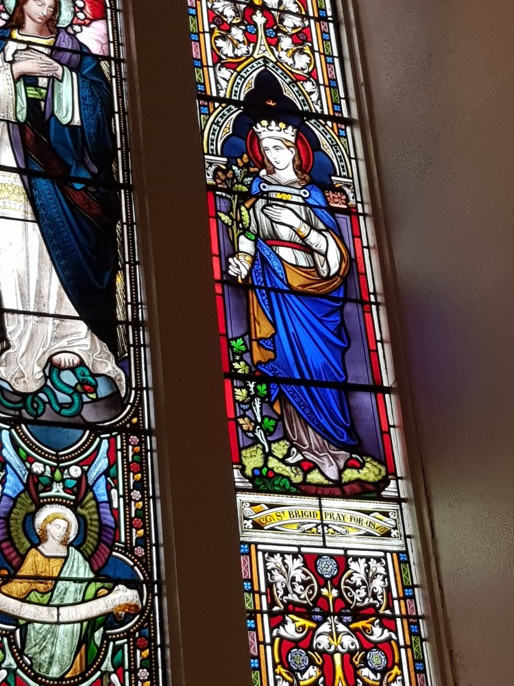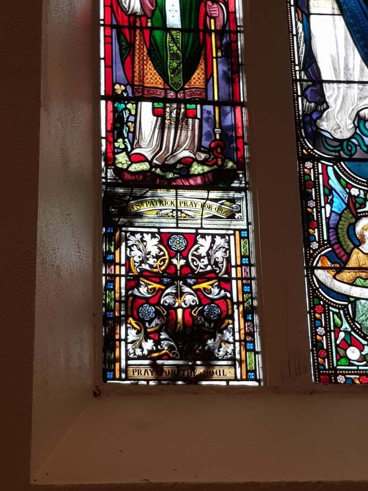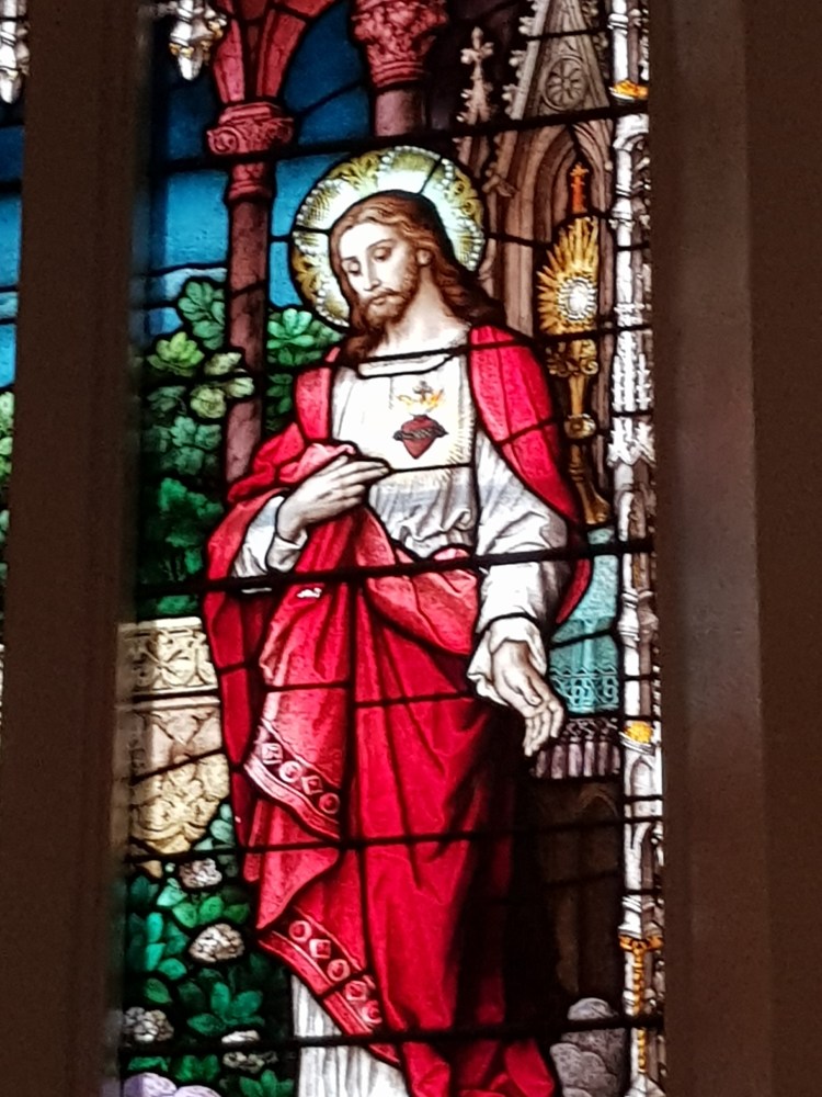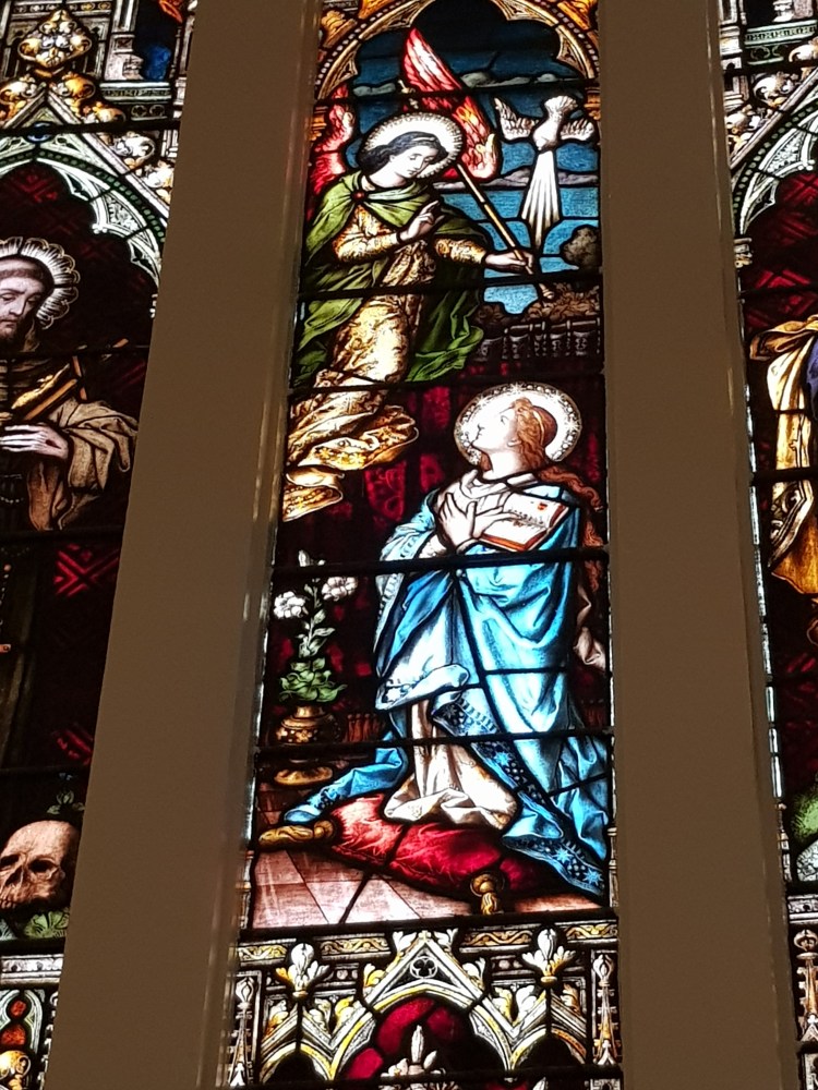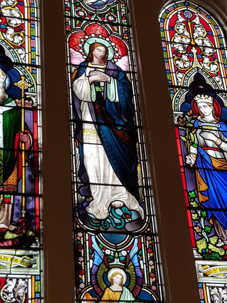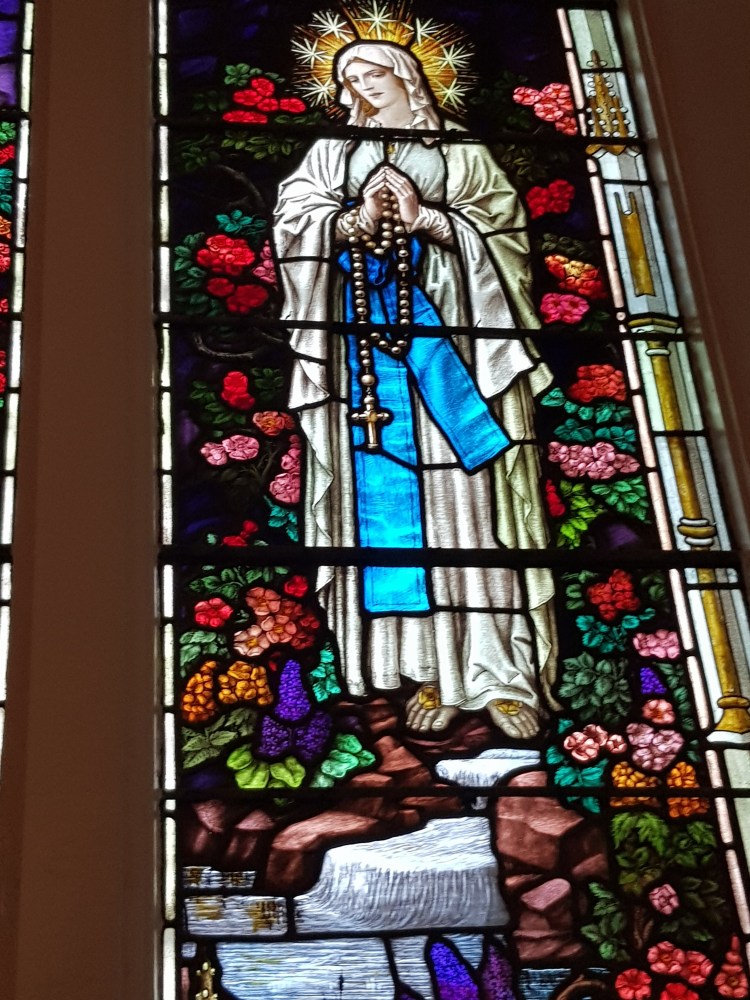The stained glass windows I found rather typical of many other Churches but the light at the time I visited (early afternoon in early Feb) gave them a luminous quality I fear I did not capture here. There were some pleasing details such as the water under the feet of Mary as she appeared to Bernadette.