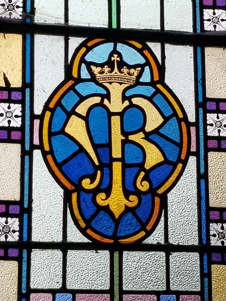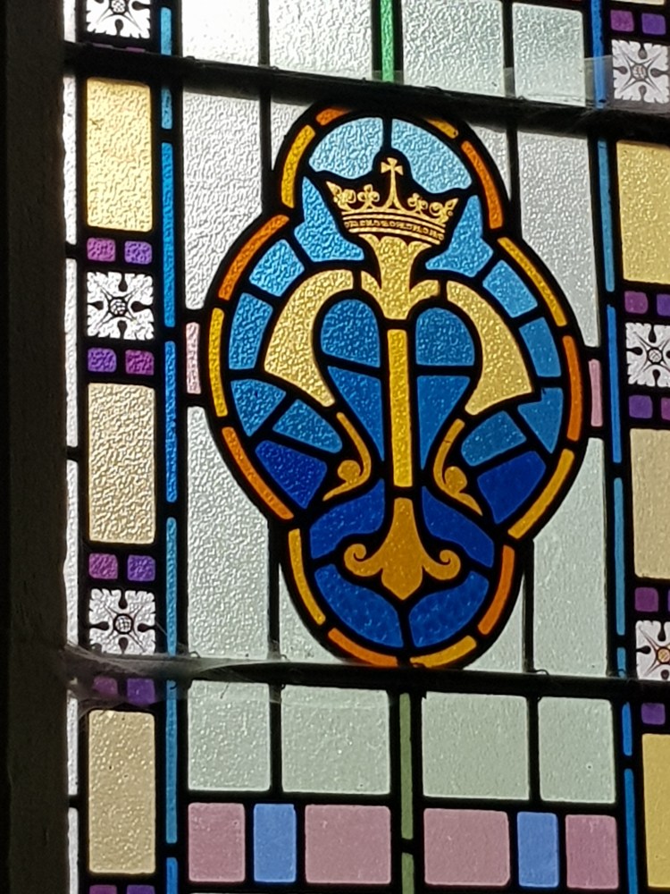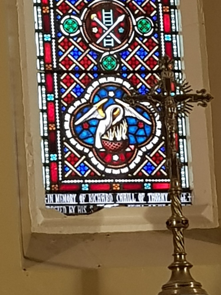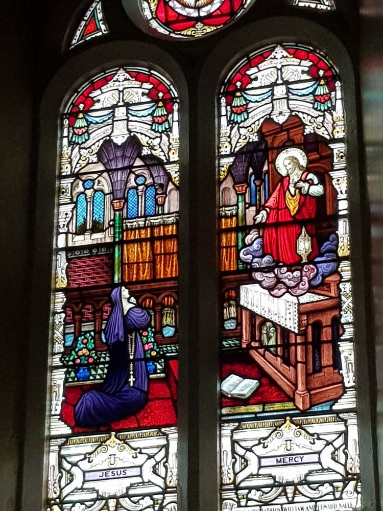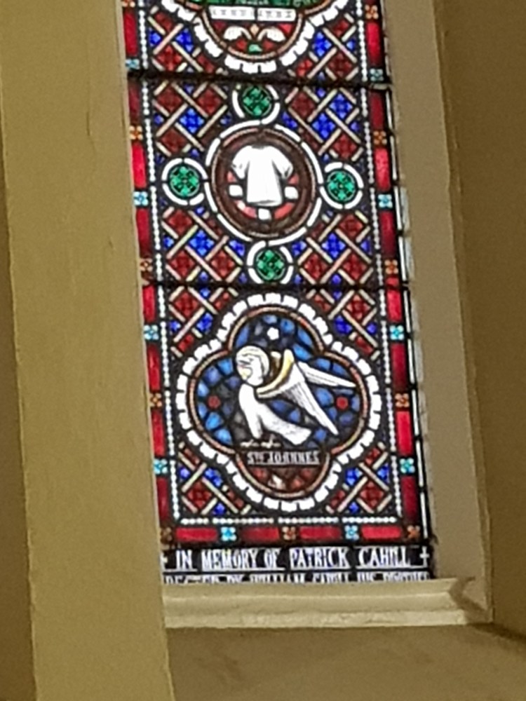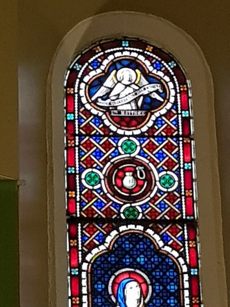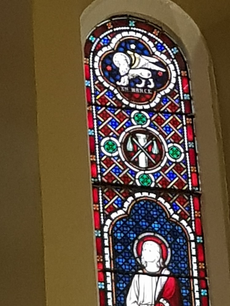The altar windows featured some neat images of the Evangelists and symbols of Christ. The mid morning light perhaps made these striking images less easily photographed: