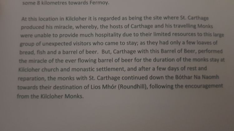 At this location in Kilcloher it is regarded as being the site where St Carthage produced his miracle, whereby, the hosts of Carthage and his travelling monks were unable to provide much hospitality due their limited resources to this large group of unexpected visitors who came to stay; as they had only a few loaves of bread, fish and a barrell of beer. But, Carthage with this Barrel of Beer, performed the miracle of the ever flowing barrel of beer for the duration of the monks stay at Kilcloher church and onastic settlement, and after a few days of rest and reparation, the monks with St Carthage continued down the Bóthar Na Naomh towards their destination of Lios Mhór (Roundhill), following the encouragement from the Kilcloher monks.