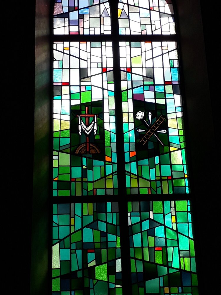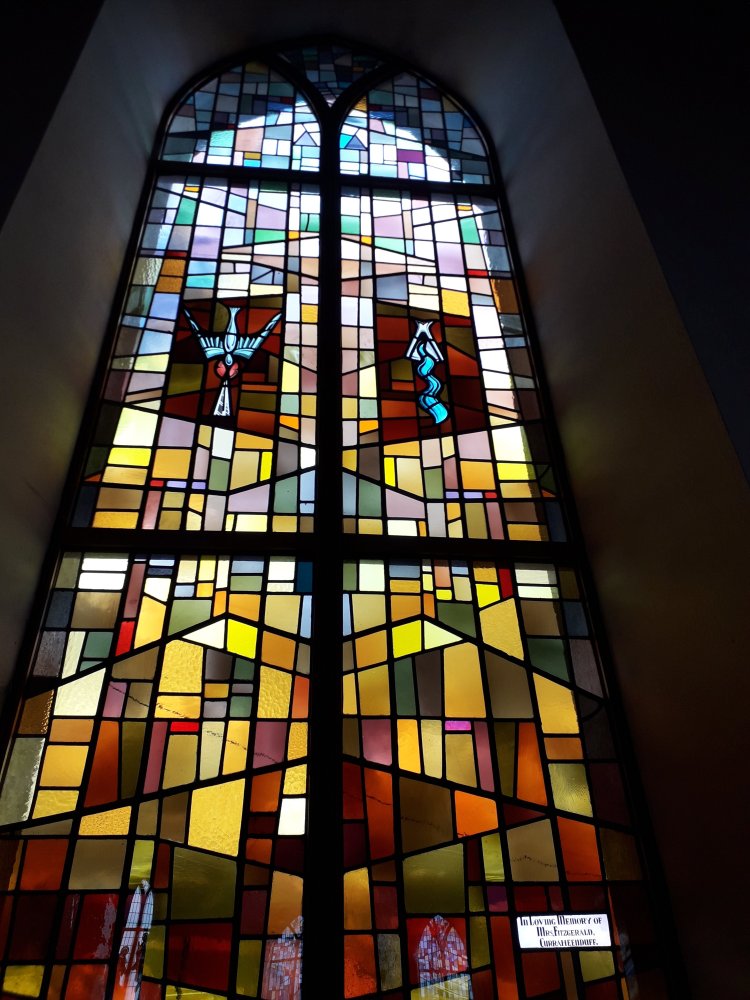The Church of the Assumption, Ballingarry has much beautiful glass; on these days of intense sun it is particularly worth visiting as some wonderful effects are created. I am dividing this post into two, firstly considering the more modern glass with themes related to the Crucifixion. I particularly liked this window with motifs of Pilate’s handwashing and Peter’s betrayal: