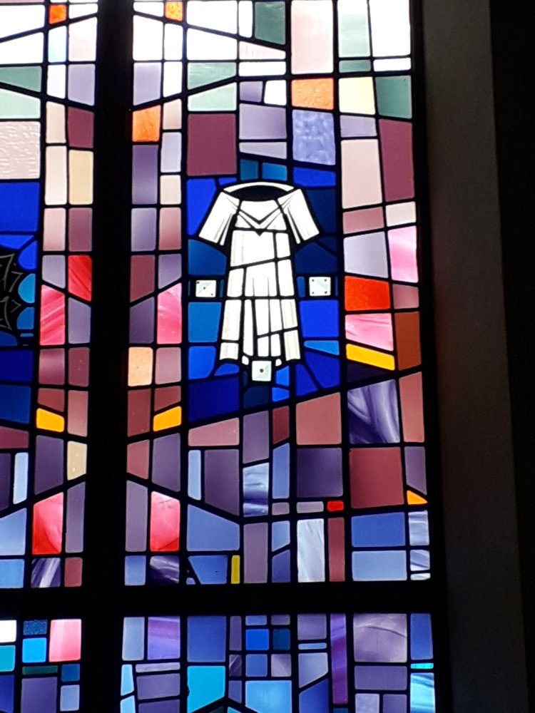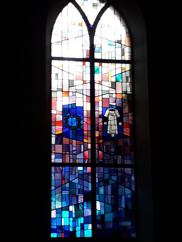 As always in these posts, I lament the quality of my pictures, and find this one of a window with a cross of thorns and the robe (with dice) didn’t capture the wonderful effect of the light: