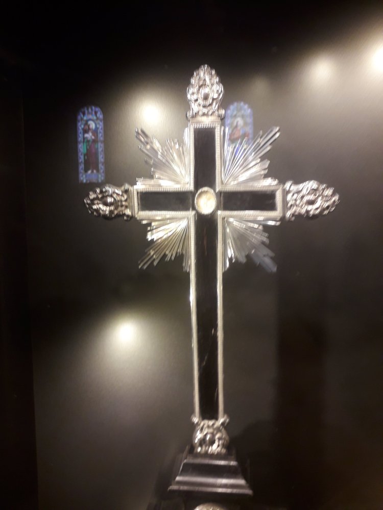 There is also a “treasury” cabinet which had varies reliquaries and objéts including a true cross relic. It was a little tricky to photograph (you may just make out the words “vera crux” on the first photo below) but in the end the reflection of the stained glass windows gave an interesting effect as in the second: