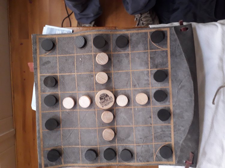 This brand of fidchell has straightforward rules. Essentially, it is an asymmetrical game with one side having more pieces, the other have fewer but a more powerful piece. Black’s aim is to capture the king piece by surrounding it on four sides (or three at the corners) although the king is invulnerable in its central stronghold. White is aiming to occupy all four corners. Pieces are captured by being surrounded on either side (either laterally or vertically, or if at the corners the immediate lateral and vertical piece) My children understood the rules immediately (though naturally enough wanted to bend them)