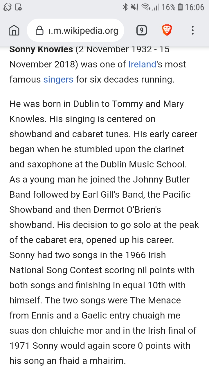 The singer Sonny Knowles “known as The Window Cleaner to his fans,”, a staple of the Irish showband scene, has died.