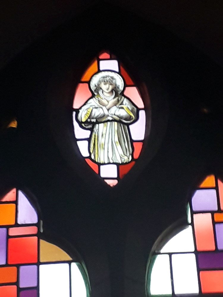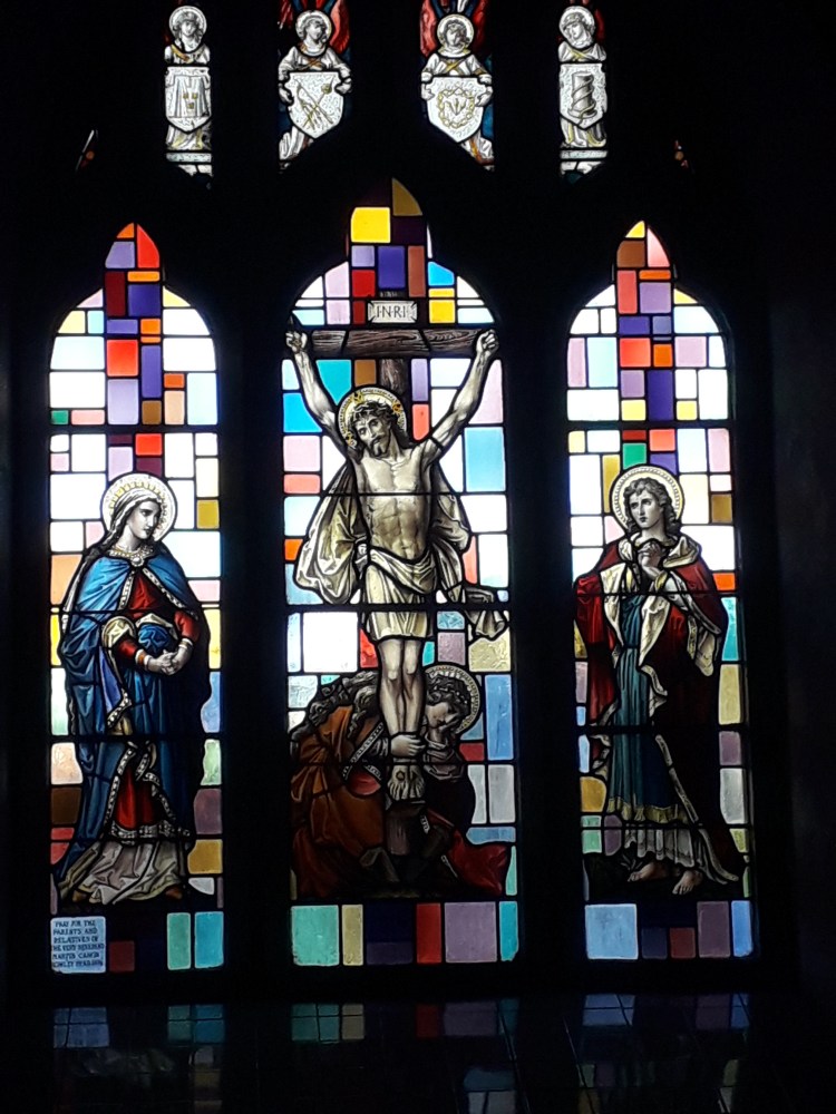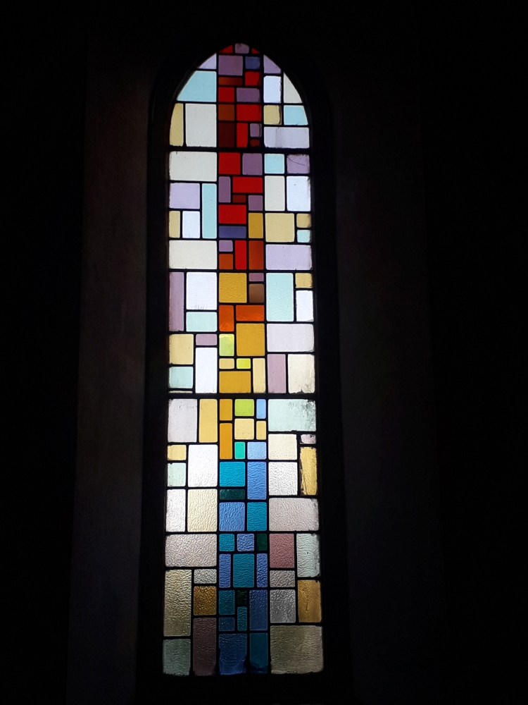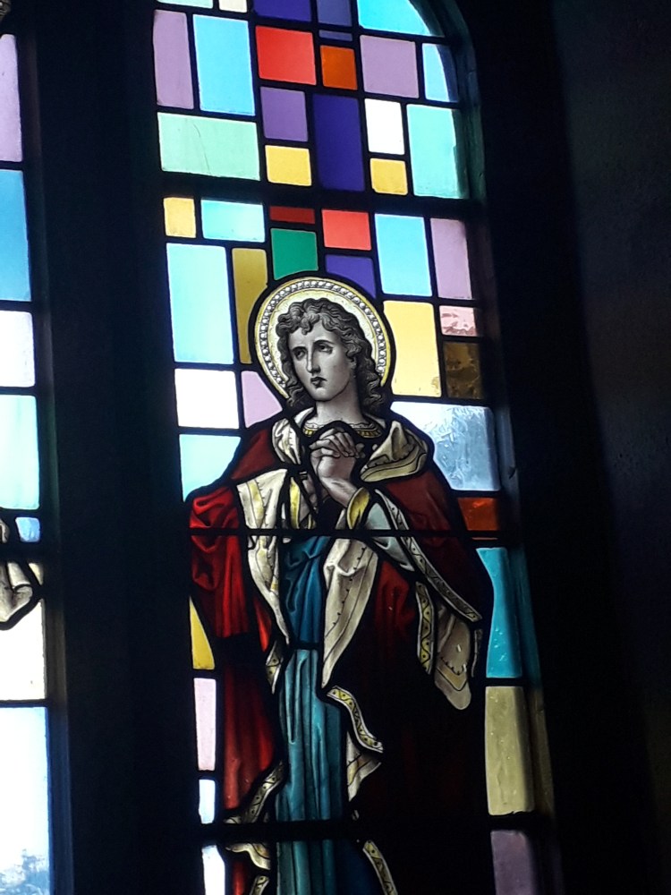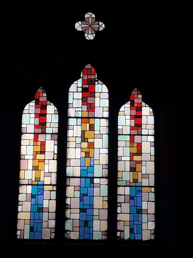 The stained glass is indeed pretty. I noted that it seemed to combine depictions of the Saints and the Holy Family typical of much stained glass of this period (indeed the faces are getting familiar now, which is not surprising as many of the windows are from the same manufacturers. Recently I have been reading more about stained glass, which will no doubt make it into a longer post at some stage) with backgrounds of coloured grass in more abstract patterns. Examples: