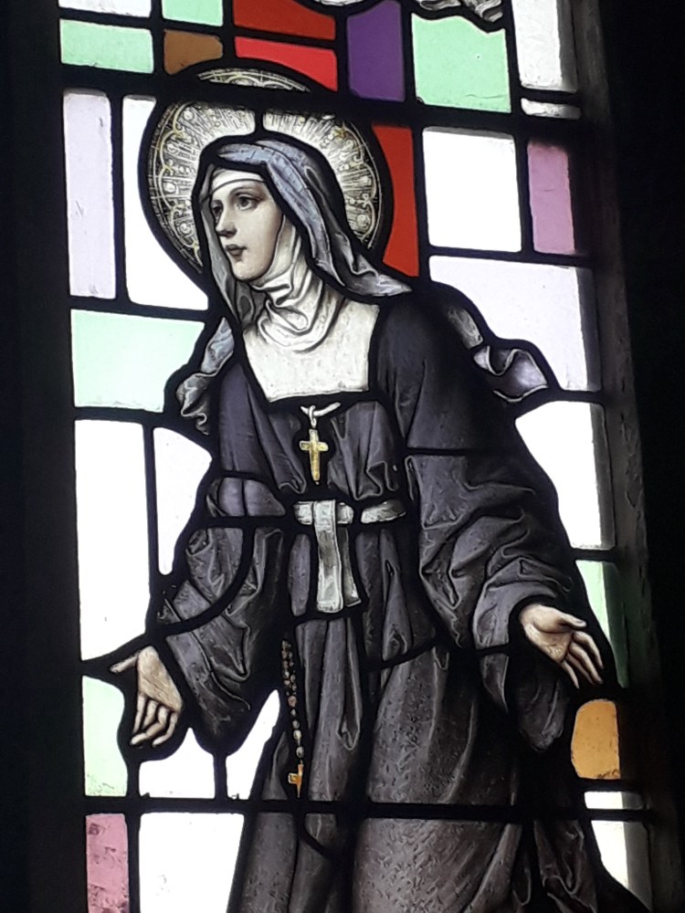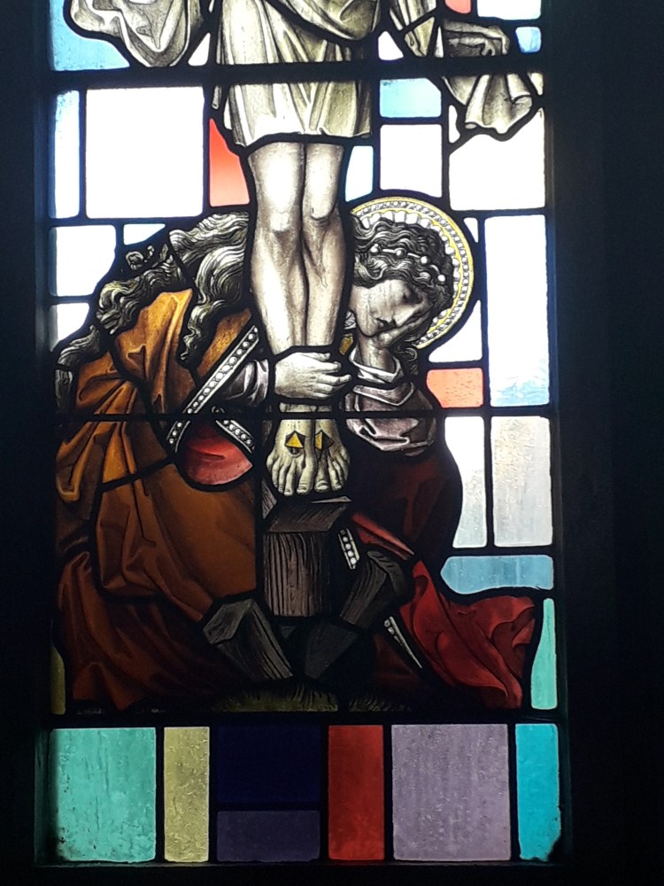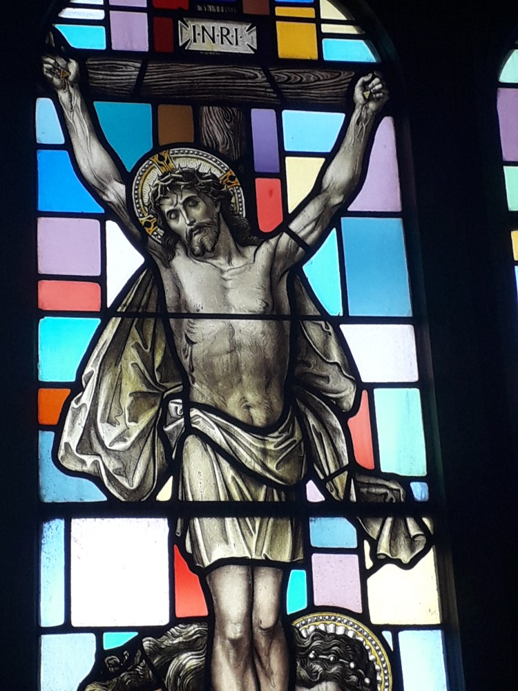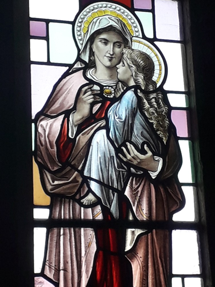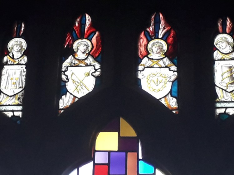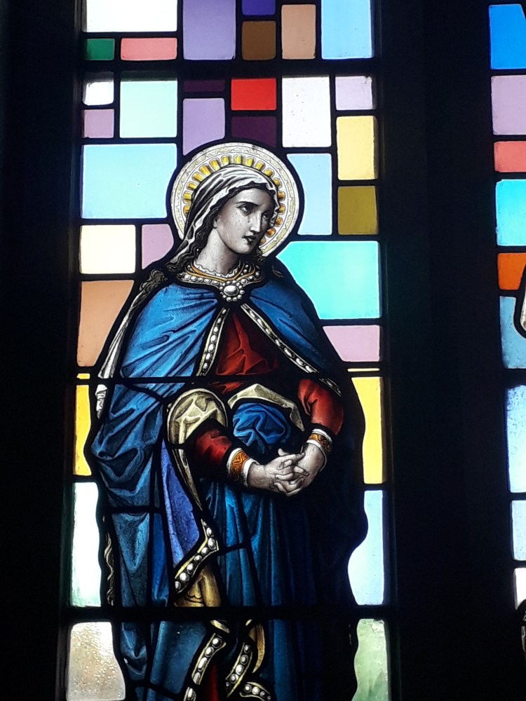 The stained glass is indeed pretty. I noted that it seemed to combine depictions of the Saints and the Holy Family typical of much stained glass of this period (indeed the faces are getting familiar now, which is not surprising as many of the windows are from the same manufacturers. Recently I have been reading more about stained glass, which will no doubt make it into a longer post at some stage) with backgrounds of coloured grass in more abstract patterns. Examples: